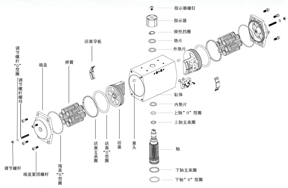 調(diào)節(jié):活塞在兩端位置有±5°的調(diào)節(jié)范圍,即:0°~90°±5°(活塞標(biāo)準(zhǔn)裝配)或者0°±5°~90°(活塞反向裝配)。